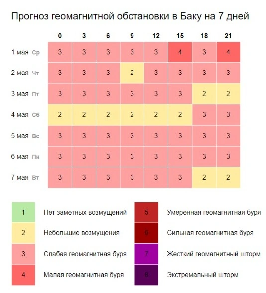 Bu gün saat 18:00-21:00 aralıqlarında isə yenidən zəif səviyyəli qasırğa müşahidə olunacaq. 21:00-da maqnit qasırğasının paytaxtımıza təsiri şiddətlənərək orta geomaqnit qasırğasına çevriləcək.