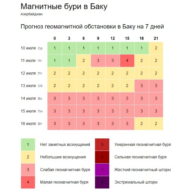 Qasırğa ayın 11-i səhər saat 06:00-dan başlayaraq yenidən aktivləşəcək. Sabah səhər saat 09:00-11:00 aralıqlarında zəif geomaqnit qasırğası müşahidə olunacaq. Daha sonra - saat 15:00-da şiddətlənərək yerini kiçik geomaqnit qasırğasına verəcək.