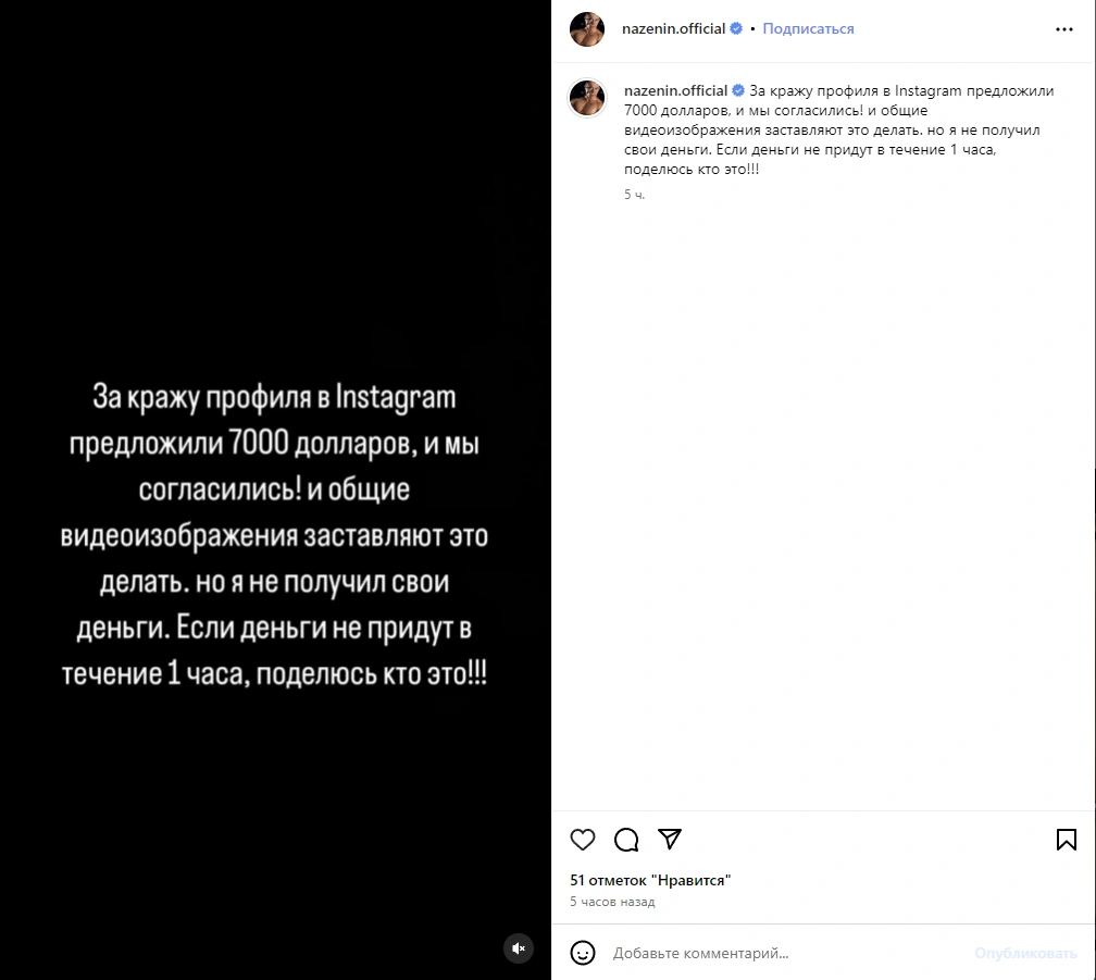 “Bu hesabın oğurlanması üçün 7000 dollar təklif etdilər və biz razılaşdıq! Amma mən öz pulumu almadım. Əgər pul 1 saat ərzində gəlməsə, bunu sifariş edəni paylaşacağam”, - səhifəni oğurlayan şəxs rus dilində yazıb.