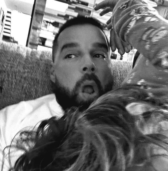 Hovuz kənarındakı şəkillərdə ulduz qızını və oğlunu çiyinlərində tutaraq, üzündə böyük təbəssümlə döymə edilmiş qollarını nümayiş etdirir. Şəkillərdə qısa saçları və kəsilmiş saqqalı ilə Riki yaraşıqlı və səliqəli görünür. Balaca Lusiya naxışlı çəhrayı çimərlik paltarı, kiçik qardaşı isə mavi mayo geyinib.