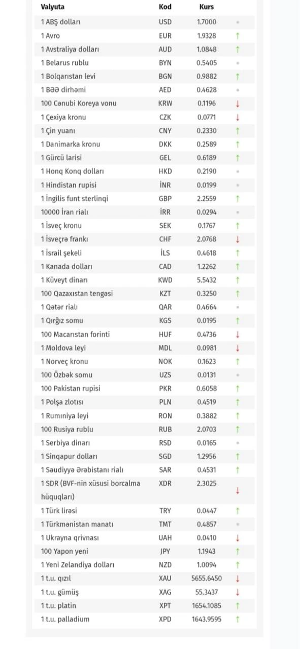 Azərbaycan Mərkəzi Bankı bu günün valyuta məzənnələrini açıqlayıb.