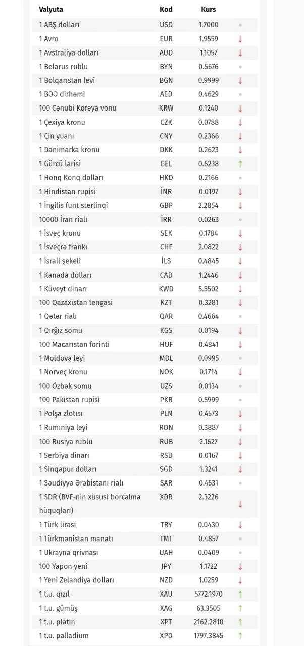 Azərbaycan Mərkəzi Bankı bu günün valyuta məzənnələrini açıqlayıb.