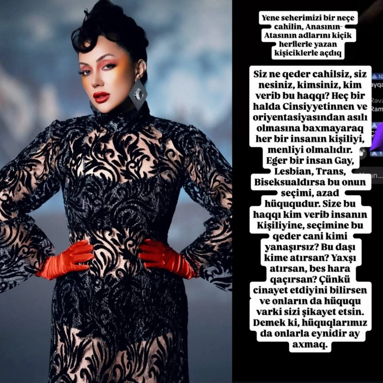 "Yenə səhərimizi bir neçə cahilin, anasının-atasının adlarını kiçik hərflərlə yazan "kişicik"lərlə açdıq. Siz nə qədər cahilsiniz, siz nəsiniz, kimsiniz, bu haqqı sizə kim verib? Cinsiyyətindən və oriyentasiyasından asılı olmasına baxmayaraq hər bir insanın kişiliyi, mənliyi olmalıdır. Əgər bir insan mavi, lezbian, trans, biseksualdırsa, bu onun seçimi, azad hüququdur. Sizə bu haqqı kim verib ki, insanın kişiliyinə, seçiminə bu qədər cani kimi yanaşırsınız? Bu daşı kimə atırsan? Yaxşı atırsan, bəs hara qaçırsan? Çünki cinayət etdiyini bilirsən və onların da hüququ var ki, sizi şikayət etsinlər. Demək ki, hüquqlarımız da onlarla eynidir, ay axmaq". /axşam.az