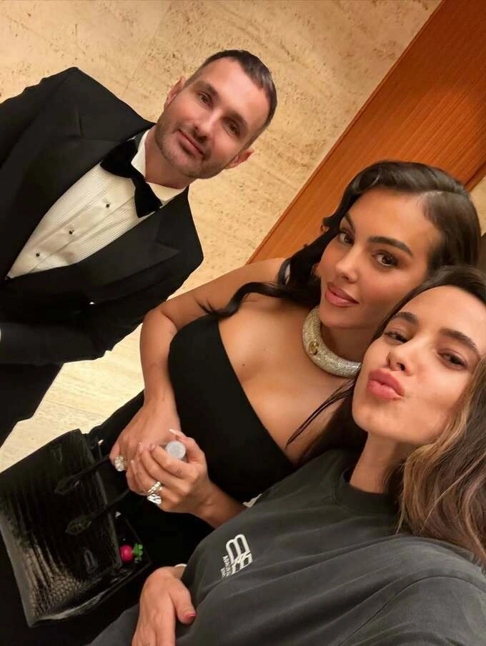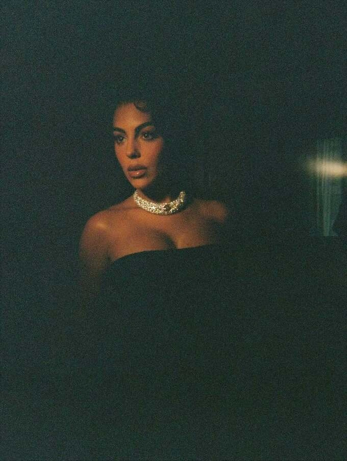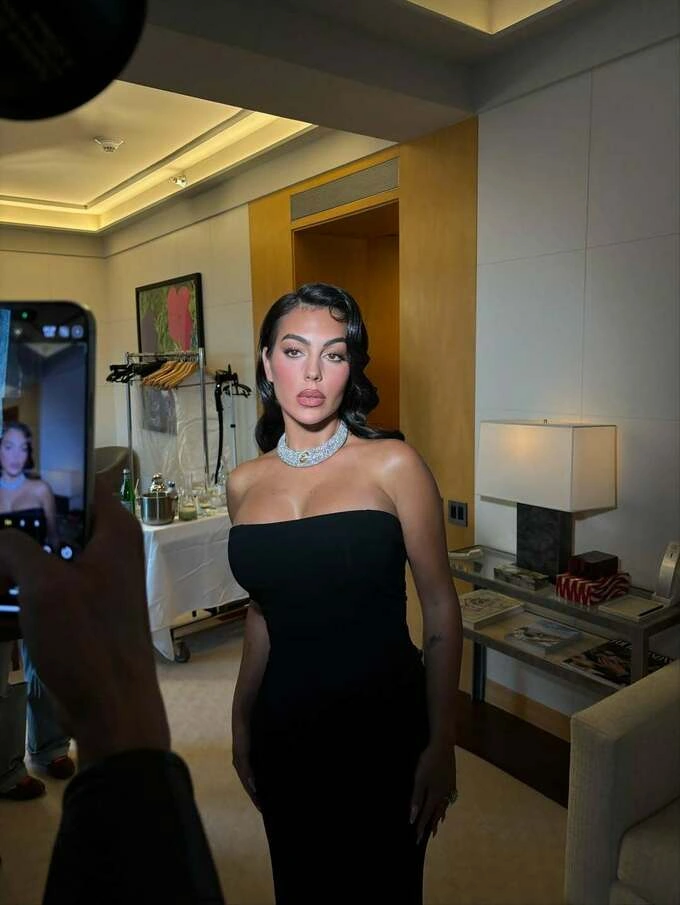 Şəkillərdə Corcina çiyinləri açıq qara libasda və iri boyunbağı ilə, həmçinin bədənini ön plana çıxaran ağ paltarda görünüb.