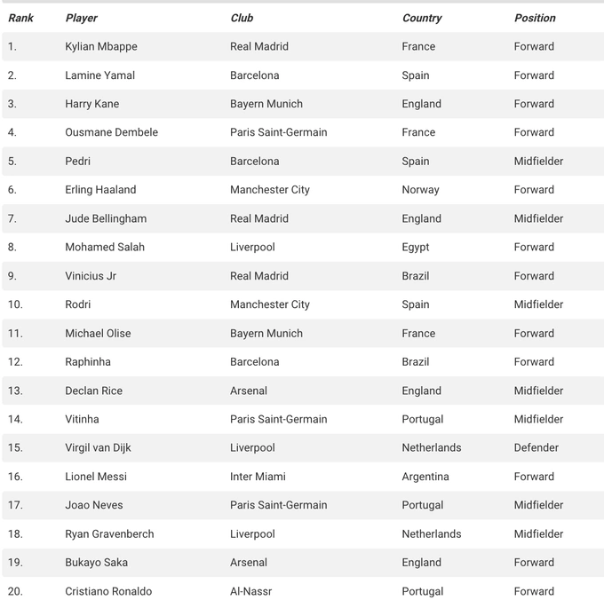 İkinci yerdə “Barselona”nın gənc ulduzu Lamin Yamal qərarlaşıb. “İlk üçlüy”ü “Bayern”in hücumçusu Harri Keyn tamamlayır.