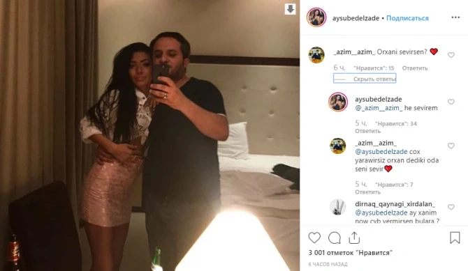 Model Aysu Bədəlzadə meyxanaçı Orxan Lökbatanlı ilə bərabər görüntüsünü paylaşıb.BAKU.WS xəbər verir ki, Aysunun paylaşdığı fotonun otel otağında çəkilməsi izləyiciləri qıcıqlandırıb. Aysunu evli kişi ilə görüşdüyü üçün ittiham edənlər də olub, onlara xoşbəxtlik arzulayanlar da. Maraqlıdır ki, şərhlərə cavab verən Aysu Orxanı sevdiyini yazıb. Qeyd edək ki, boşanma ərəfəsində olduğu deyilən Orxan Lökbatanlı model Aysu Bədəlzadə ilə sevgili olması xəbərlərini təkzib edir. O, heç kimlə sevgili olmadığını, ailəsində isə hər şeyin qaydasında olduğunu bildirib. Xatırladaq ki, model Aysu Bədəlzadə ATV telekanalında yayımlanan “Dəb Mənəm” verilişi ilə məşhurlaşıb.Aysel