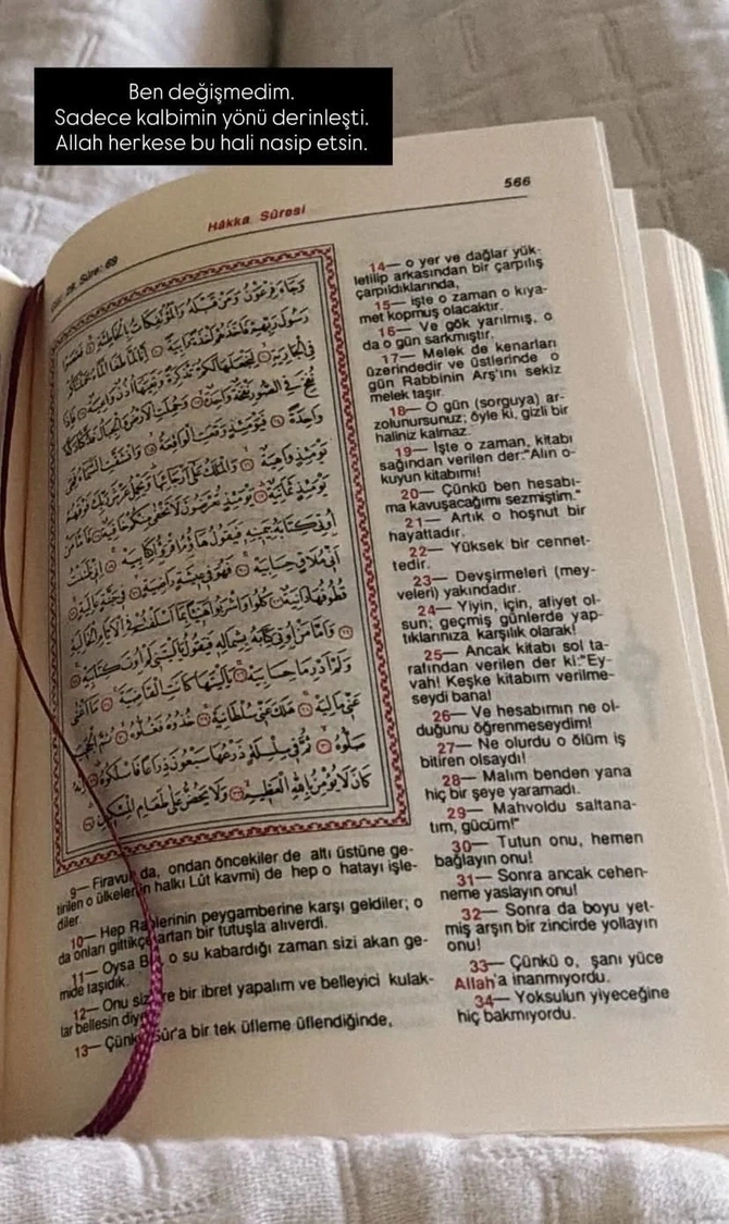 Şeyma Subaşı "Mən dəyişmədim. Sadəcə ürəyimin istiqamətini dərinləşdi. Allah hamıya bu halı yaşatsın!" deyə paylaşdığı ayələrə əlavə edib.