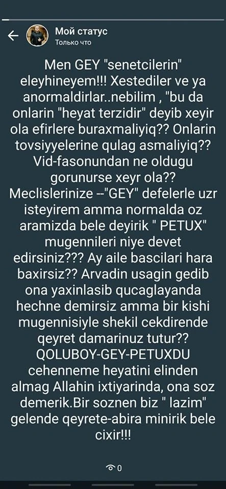 BAKU.WS xəbər verir ki, gənc ifaçı "Facebook" səhifəsində cinsi azlıq nümayəndəsi olan həmkarlarına qarşı üsyanını belə izhar edib: