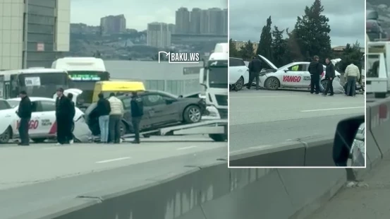 Hadisə şahidinin sözlərinə görə, 5 avtomobil bir-birinə çırpılıb. Nəticədə xəsarət alan var.