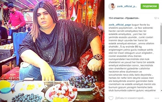 BAKU.WS məlumat verir ki, rejissor bu haqda İnstaqram hesabında yazıb. Zorik 5 ay ərzində əməliyyatsız 86 kq arıqladğını bildirib: