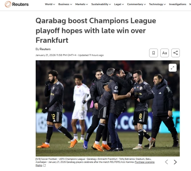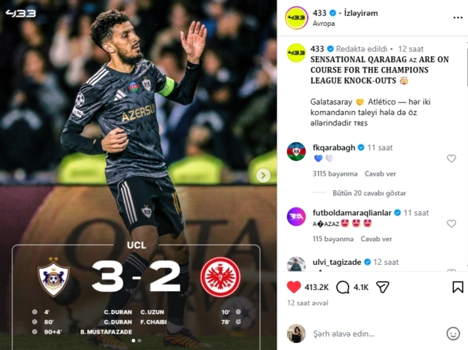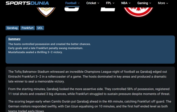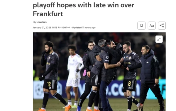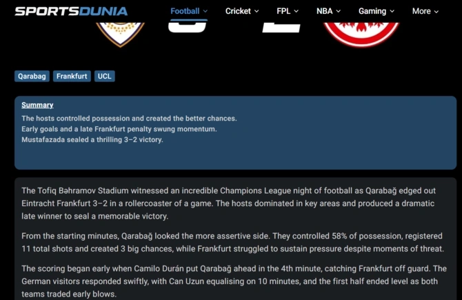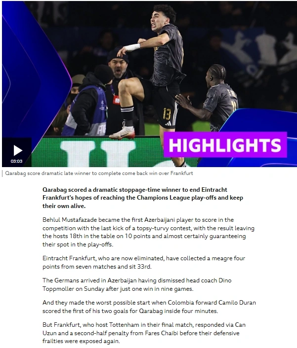 "Tofiq Bəhramov stadionunda inanılmaz Çempionlar Liqası gecəsi keçirildi. "Qarabağ" "Ayntraxt Frankfurt"u 3:2 hesabı ilə məğlub etdi. Ev sahibləri əsas hissələrdə üstünlük göstərdilər və yaddaqalan qələbəni təmin etmək üçün son dəqiqələrdə dramatik qələbə qolunu vurdular".