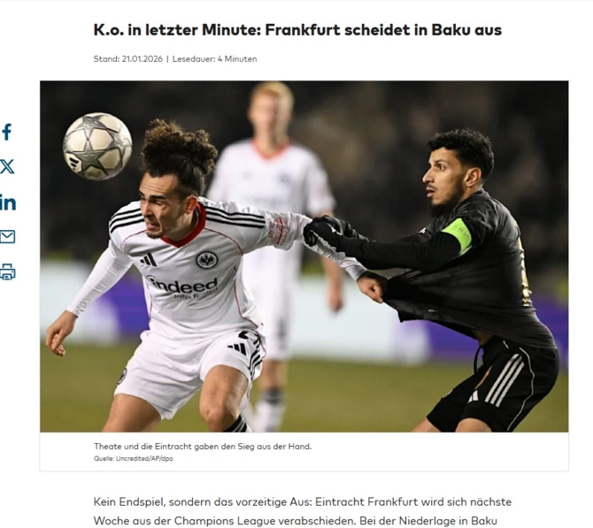 "Ayntraxt Frankfurt"un ağ formalı adamları ağdam təmsilçisi olan "Qarabağ" komandasının qara geyimli oyunçuları arasında yoxa çıxdı və sonra mümkün qədər tez soyunma otağına qayıtdı. Çempionlar Liqasında son dəqiqədə acı nokautdan sonra Robin Koç və komanda yoldaşları sadəcə Bakının dondurucu soyuğundan uzaqlaşmaq istəyirdilər", - bu cümlələr "Welt.de" nəşrinin səhifələrində yer alıb.