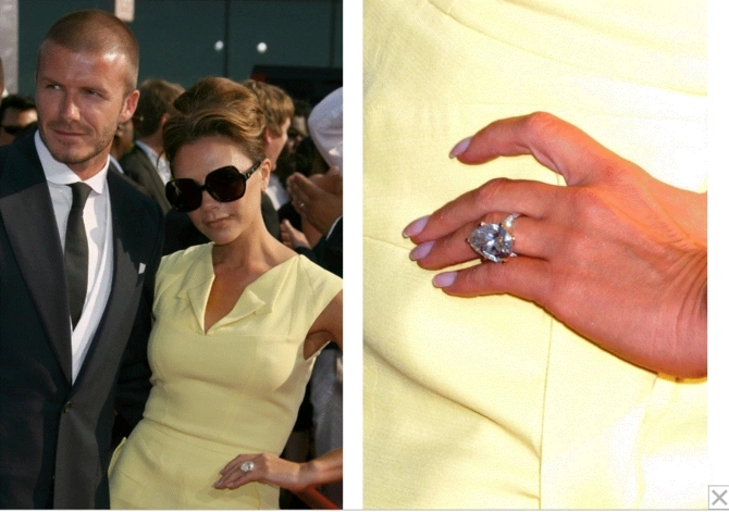 1998-ci ildə Viktoriyanın ilk nişan üzüyü 3 karatlıq markiza kəsimli brilyant idi. Qiyməti təxminən 85.000 dollar idi və Viktoriya bu üzüyə görə o vaxt çox sevinirdi. Lakin bu bir başlanğıc idi. İllər ərzində Devid ona hələ bundan da bahalı üzüklər alacaqdı.